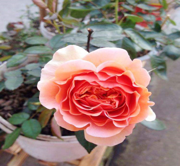 音樂廳月季的外形特別漂亮,而且是多個季節盛開。它有點像老玫瑰花型,開花形式是四等分。音樂廳月季有著獨特的色彩和卷曲又緊密的花瓣。音樂廳的形狀是花杯狀滿心,花開放后稍卷邊。它的花徑在7-8厘米左右,它的顏色有橙粉色,還有一些是紅橘色,顏色根據品種和季節溫度會產生變化。音樂廳的花是重瓣,它的花瓣數大概有100多枚瓣。它的香味也挺獨特,聞起來有點像桃香,還有一點像芒果的香味,這種果香味道雖然特別濃,但是卻特別的好聞,濃香卻不膩。