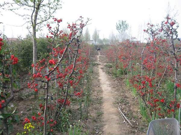 木瓜海棠能生在多種土地里,對泥土的標準不高,黃土地,黑泥地,沙土都能種植,但是要求排水順暢,地面平坦,夏季雨水充沛的期間,也可維持地表不汪水,同時還可以迅速的排出汪水,輕微鹽堿地肯定也是沒問題的,紅梅其實是一個比較耐鹽的苗木,在浙江,廣東等海邊地區栽種長的很棒。平時保養管理事情很少,主要工作就是修剪枝條,追肥,除草,殺滅病蟲害等,木瓜海棠病蟲害很少,主要是預防吃樹葉大青蟲白蛾幼蟲就行。