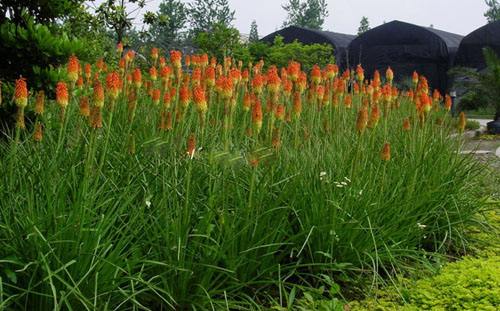 火炬花如同它的名字一樣,開花時就像燃燒的火炬,花色為鮮艷的紅色,十分耀眼奪目,這種花卉的植株比較高,生長的很整齊,葉片茂盛,被大量用于園林栽培中